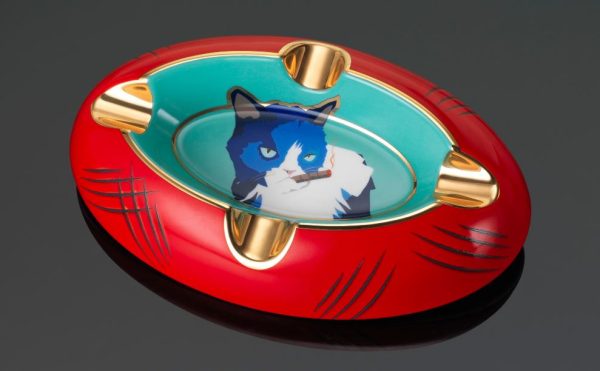 Made of fine bone chna, this Grumpy Cat ashtray is decorated with contrasting colors and gold cigar rests for highlights.