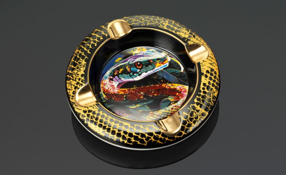 The snake sympbolizes a mysterious, wise and determined character. This Snake series will bring colorful vibes to your collection. Made of quality fine bone china, this ashtray is luxurious/ With real gold content, the gold cigar rests on the ashtray are shiny and do not tarnish over time.